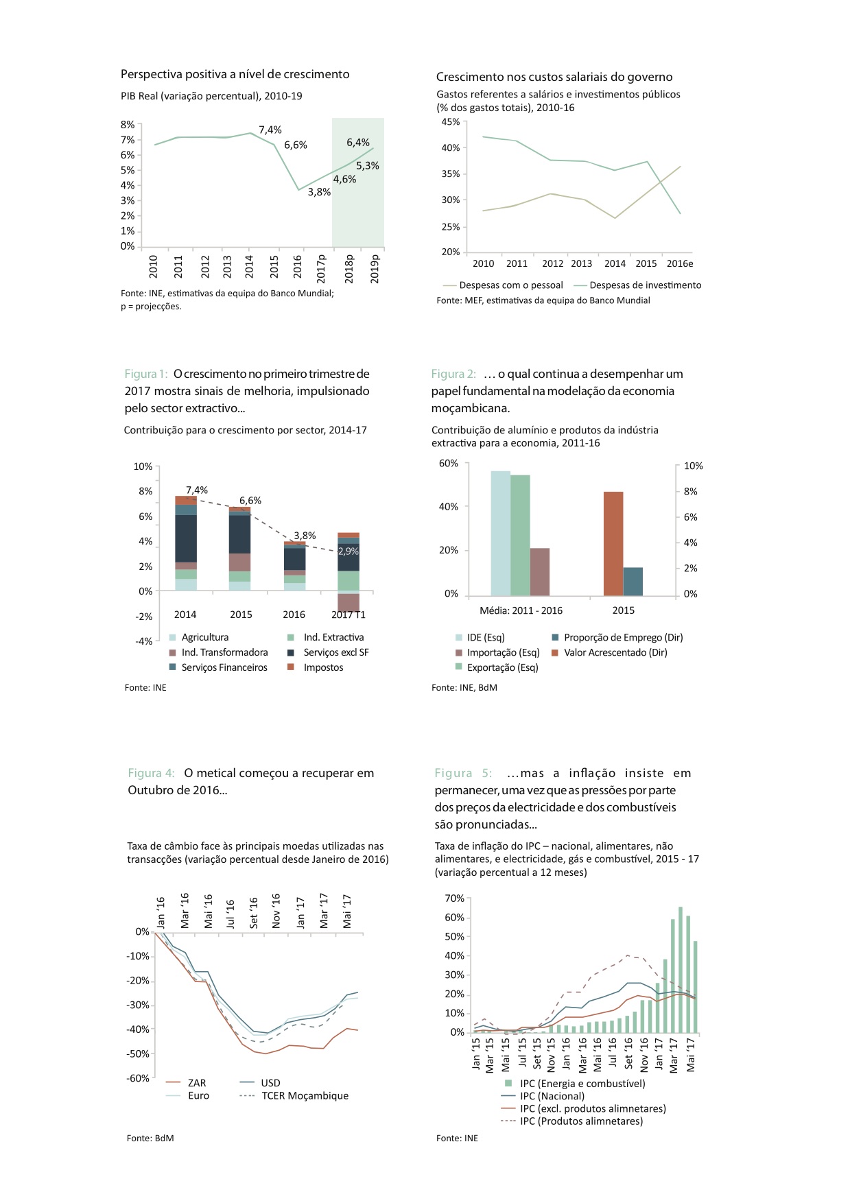 Nesse contexto, o documento em causa, assinado por espelialistas do Banco Mundial (BM), revela que em 2017, o crescimento do PIB no primeiro trimestre chegou aos 2,9 %, mais do que o dobro da taxa de crescimento do trimestre anterior. O metical, que tinha vindo constantemente a depreciar-se face ao dólar durante os primeiros dez meses de 2016, encontra-se agora mais estável, após ter subido 28% nos últimos 9 meses relativamente ao dólar americano. Uma forte resposta a nível de política monetária foi fundamental para essa mudança, a qual também ajudou a inflação a abrandar lentamente até meados de 2017. Além disso, as reservas internacionais estão a recuperar, uma vez que as exportações aceleraram ao mesmo tempo em que as importações se mantiveram moderadas. A melhoria dos preços das matérias-primas e uma indústria de carvão em recuperação são factores centrais para estas tendências, contribuindo também para as perspectivas de crescimento.